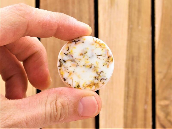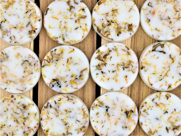 Cire végétale de colza , essence parfumée (Pêche), végétaux (Calendula officinalis).