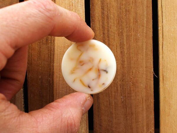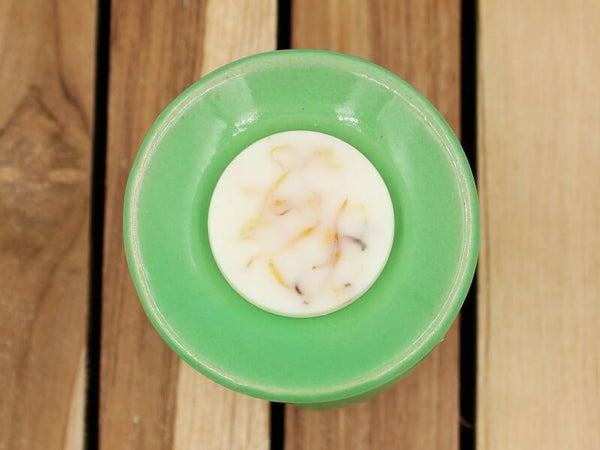 Cire végétale de colza , essence parfumée (Ylang-ylang), végétaux (Calendula).