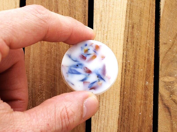 Cire de colza , essence parfumée (Soie & Cachemire), végétaux (Centaurea cyanus, Chrysanthemum).