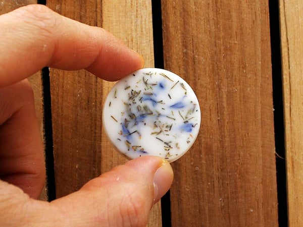 Cire de colza , essence parfumée (Week-end en Corse), végétaux (Centaurea cyanus, Thymus).